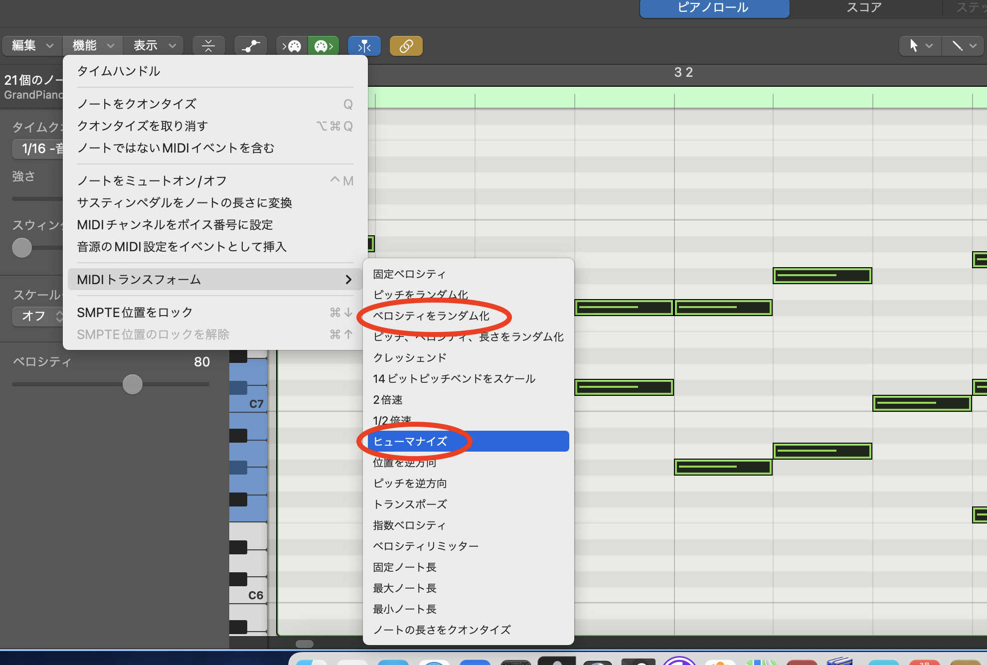 Logic Pro - 鍵盤のトラックでコードの音を置いていくとベロシティーが同じになるが後からベロシティーにランダマイズやヒューマナイズする方法はあるか
