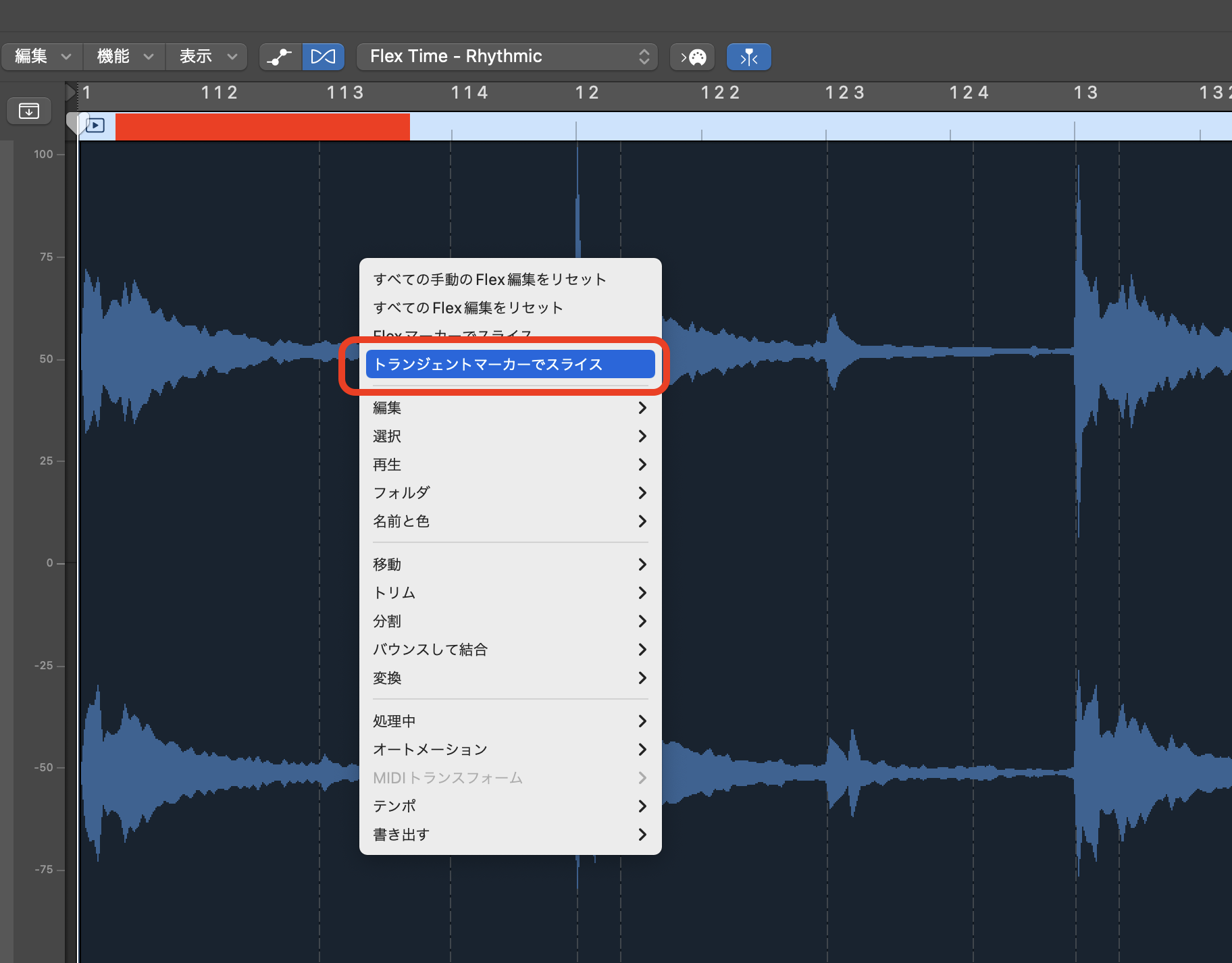 オーディオ編集画面でトランジェントを検出させマーカーをつけるところまでは良いのですが、