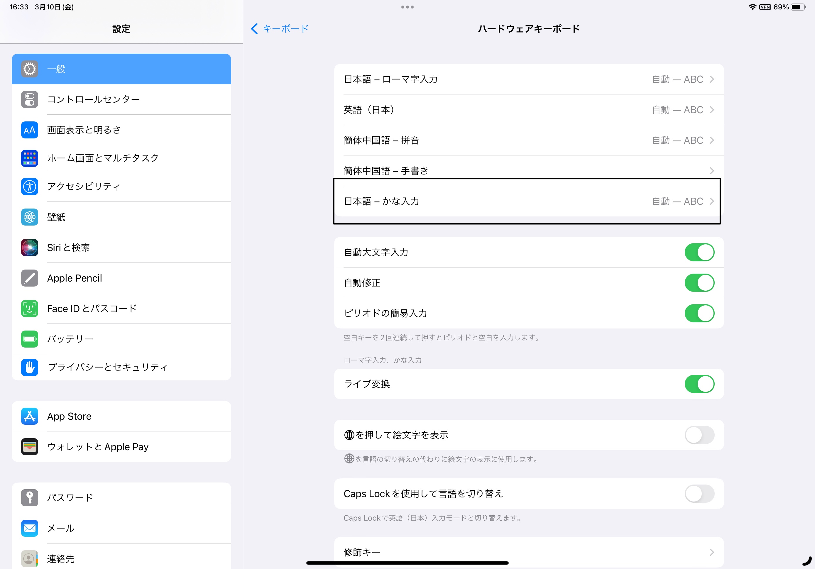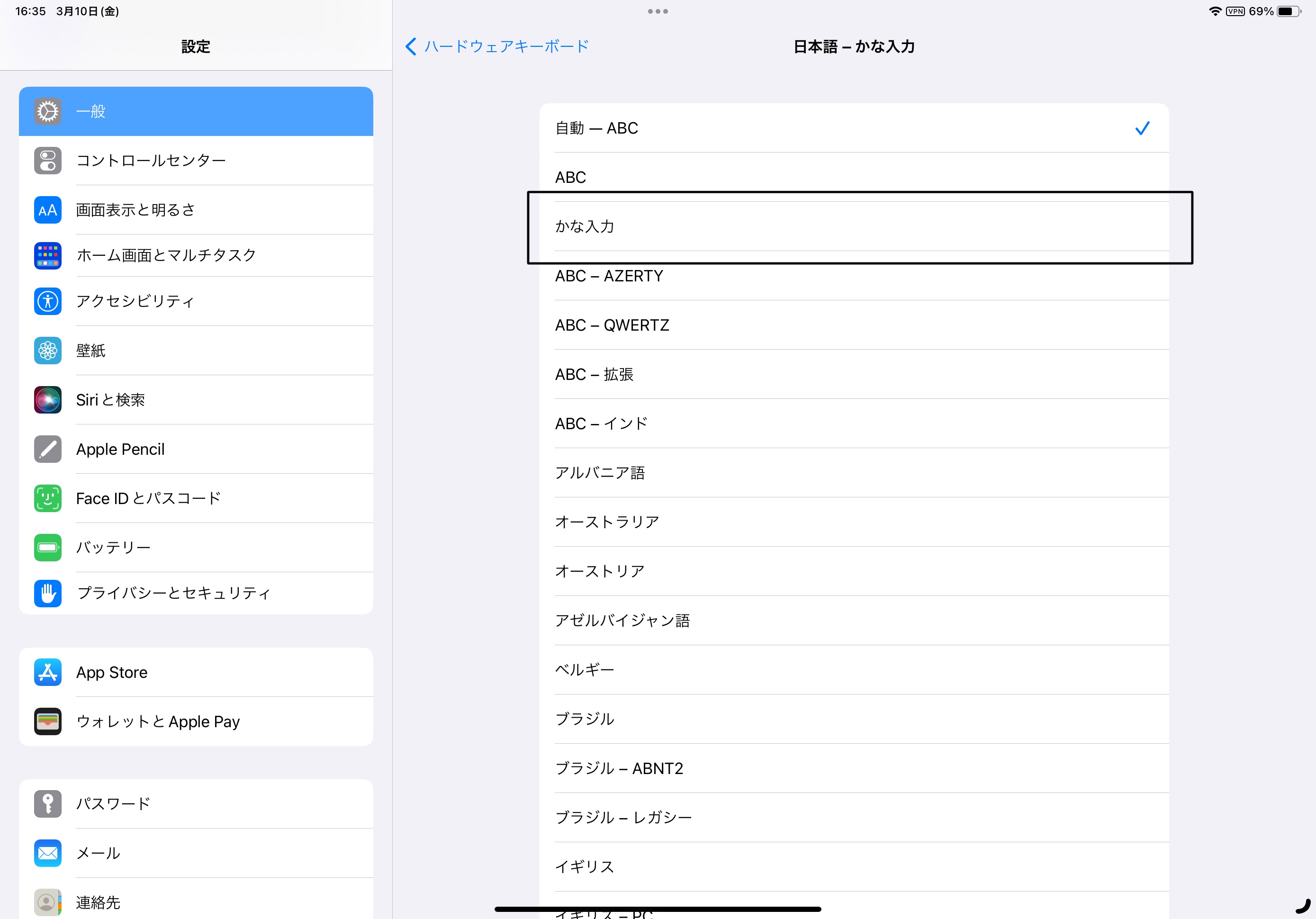 の通りにすることで外付けキーボードでかな入力をすることができます。