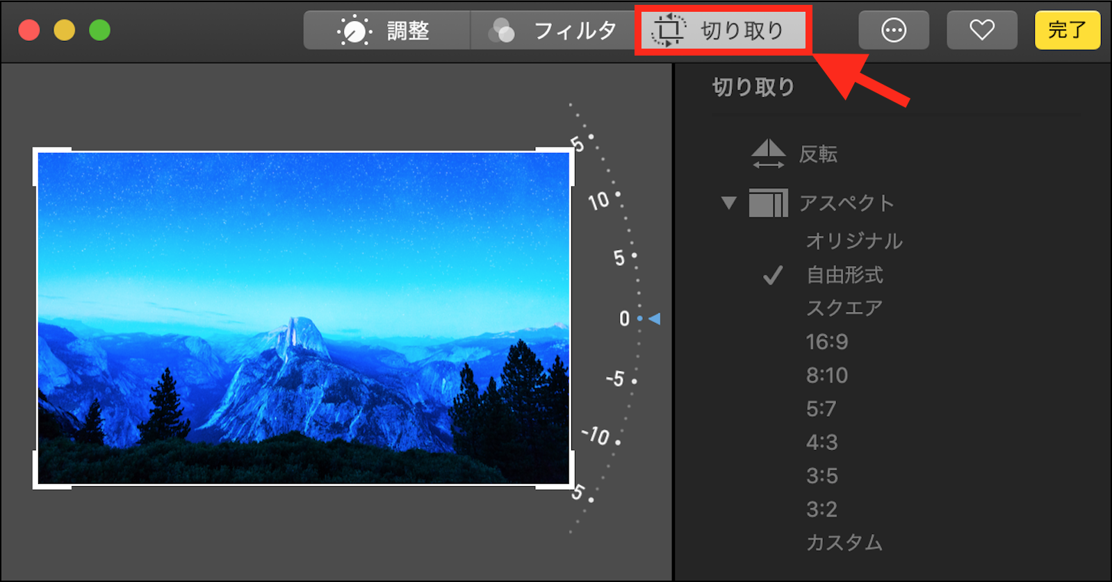 MACの写真アプリで写真を自由な角度に回転させる時に使う「分度器の目盛のようなダイアル」が急に表示されなくなり、写真の自由な回転が出来なくなってしまいました。何か特別な操作をした記憶は無いです。設定等を調べましたが、それらしいものは見当たりません。前述の「分度器の目盛のようなダイアル」を表示させる方法をご存知でしたら教えて頂けないでしょうか?