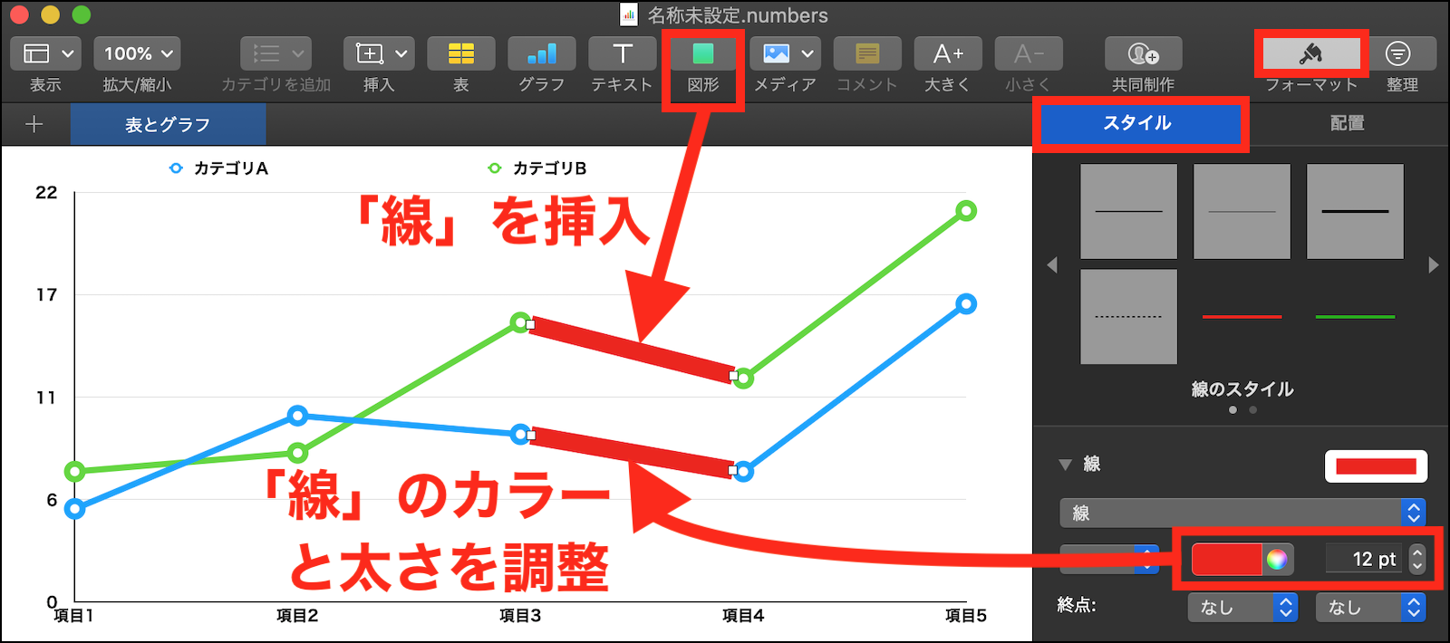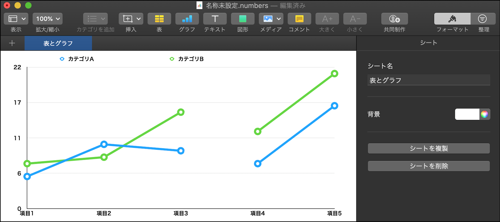 残念ながら、「Numbers」では「Excel」の様に、設定で折れ線グラフの一部の線を消す事は出来ないと思いますので、以下の様に行なって見ては如何でしょうか?