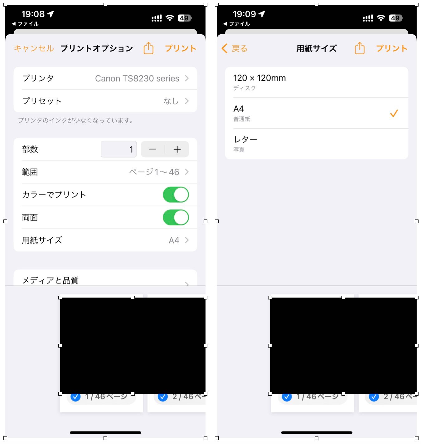 プリンターAの場合、もともと私のiPhoneからではハガキサイズ(A5)しか認識してくれず、自動的にプリンター側の用紙の入ってないA5の引き出しが稼働し「用紙切れ」ですとなってプリントができず、ということがありました。