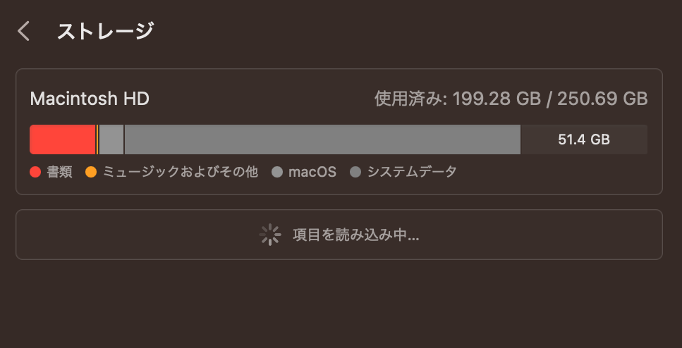 それより、macOSに用意されてるストレージの内訳のところで(システム情報>一般>ストレージを開ける)、ⓘをタップすると構成する中身のサイズが出てきます。いらないものを削除して改善できませんか?