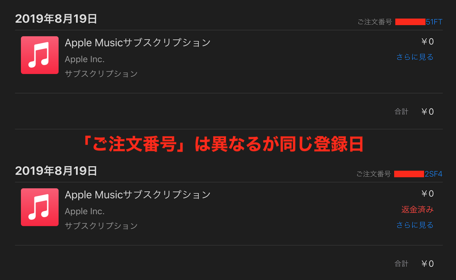 私も以前、下の画像の様に「ご注文番号」は異なるが、同じ登録日の Apple Music が二重に表示されていて、驚いて Apple サポートに確認した事が有りますが、「以前に Apple Music 3 ヶ月無料トライアル等に登録した事が有り、再度 Apple Music 1 ヶ月無料トライアル等に登録した場合、システムの処理上、二重に表示されてしまう事が有りますが、無料トライアル期間終了日の少なくとも 24 時間以上前に、下記リンクの手順で解約手続きを行なって頂ければ、無料トライアル期間終了後に料金を請求される事は有りませんので、ご安心下さい」との事でした。