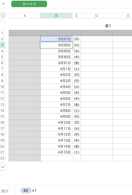 この例では、最初のB2のセルに目的の日付を入れてやるだけで、後のセルには自動で正しい日付と曜日が入ります。