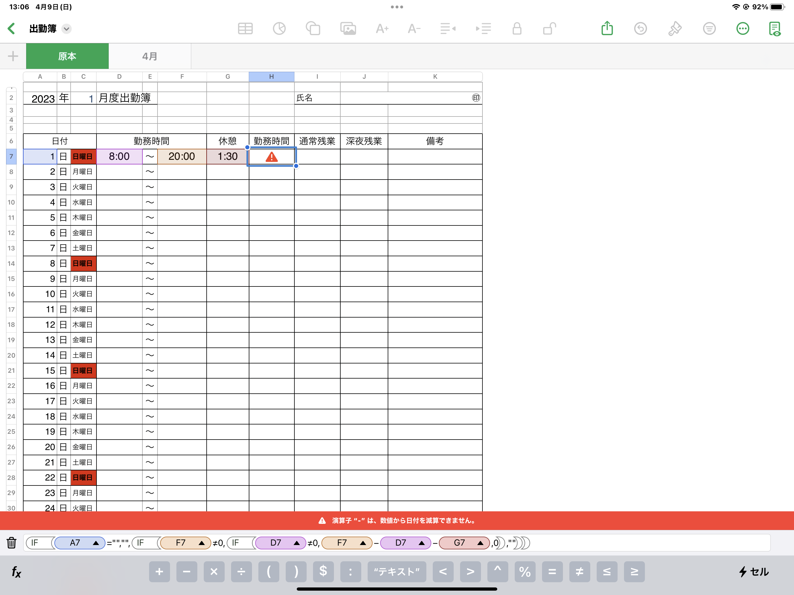 上記の内容は関数で曜日、日を自動にできましたが、退勤時間から出勤時間、休憩時間を引いて勤務時間にしようとすると、エラーが出てしまいます。