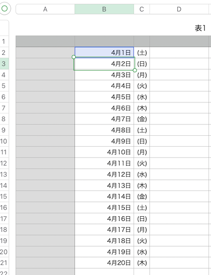 この例では、最初のB2のセルに目的の日付を入れてやるだけで、後のセルには自動で正しい日付と曜日が入ります。