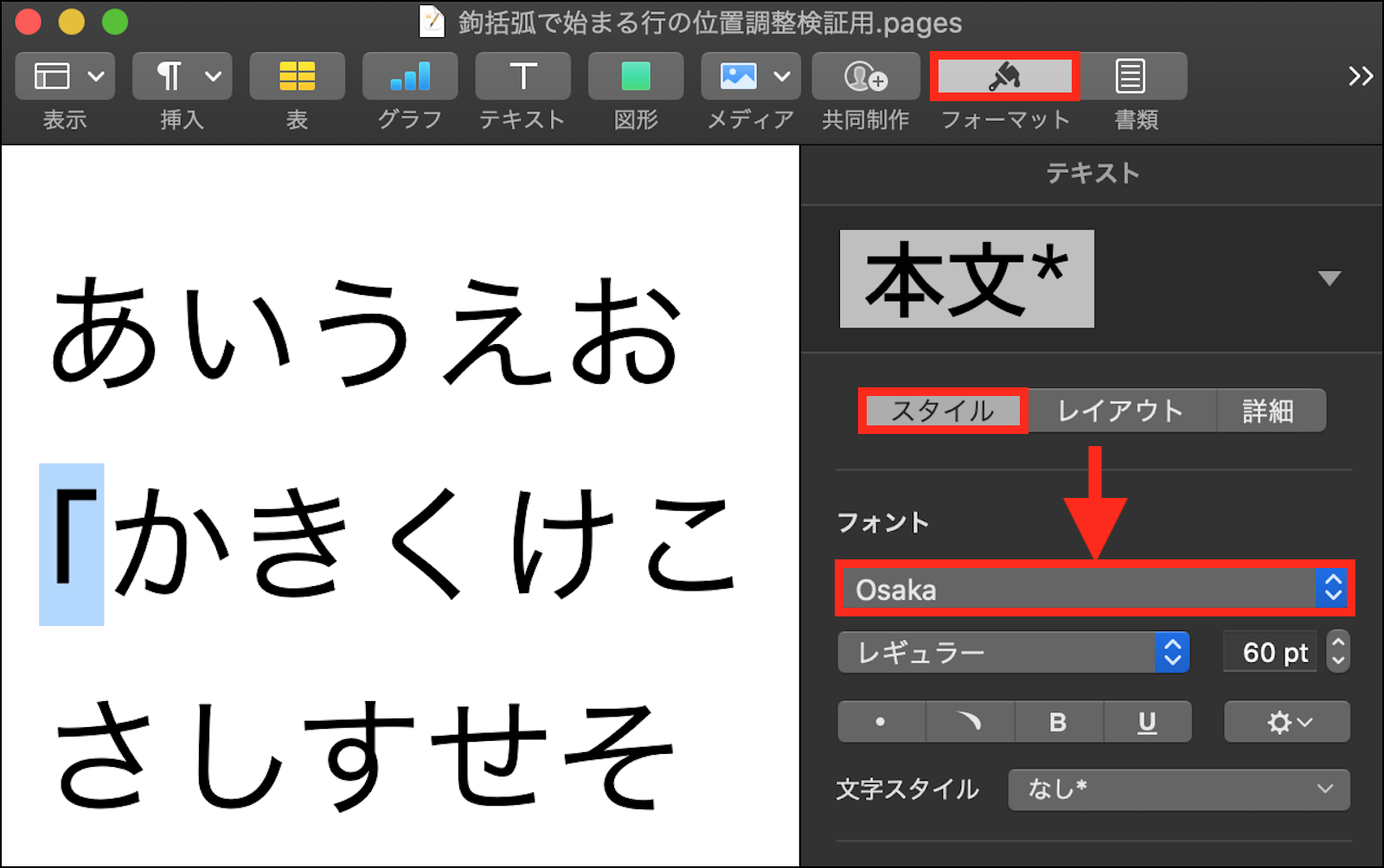 細かな調整は行えませんが、下の画像の様に、鉤括弧を選択した状態で、ツールバーの「フォーマット」インスペクタ >「スタイル」タブ >「フォント」セクションの使用フォントを、以下の何れかに変更 する事で、鉤括弧で始まる行とそうでない行を、或る程度揃える事が出来ます。