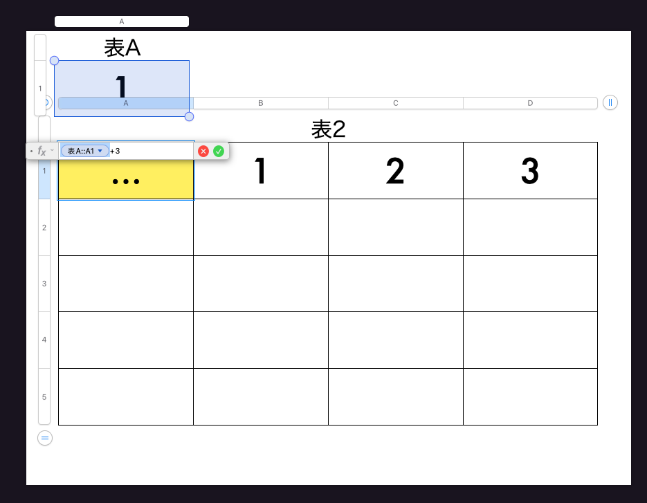 既に「スライド2」に「表2」を作成されていて、直接セルに数式を入力する場合は、数式エディタには入力時に半角英数字や記号しか表示されませんので、下の画像の様にツールバーからテキストボックスを追加して「スライド1::表1::A1+3」と入力し、入力した文字列を全選択して「command」+「C」キーでコピーし、「command」+「V」キーで数式エディタにペーストすると、