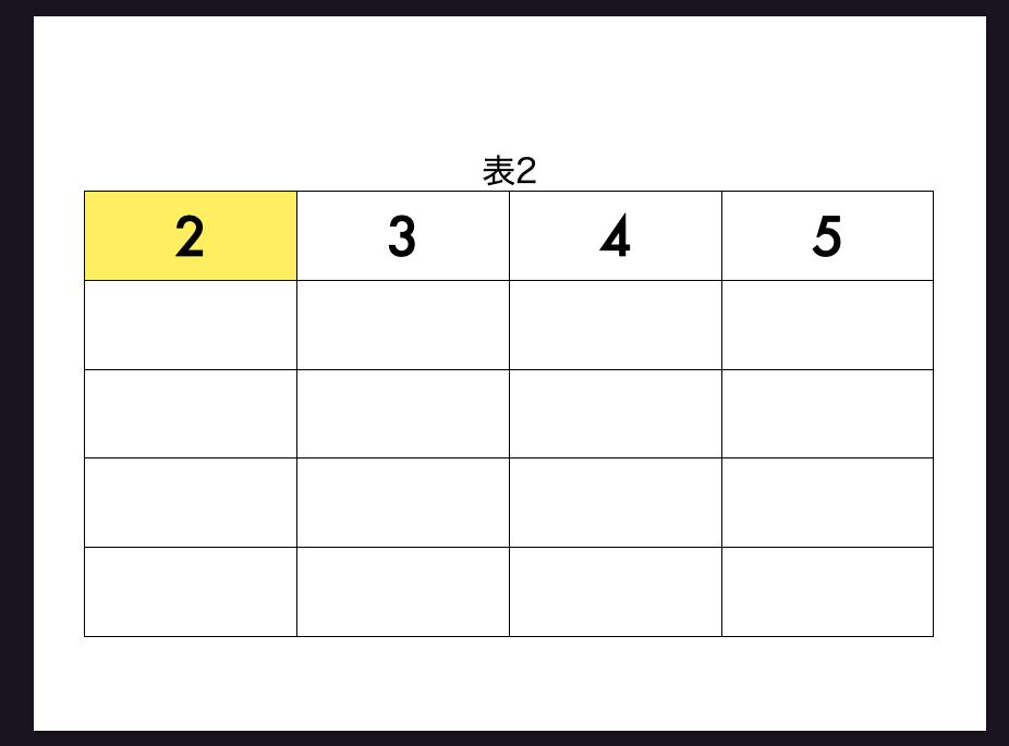 (「スライド1」に作成した「表2」は、表全体を選択して「delete」キーで削除して置いて下さい)