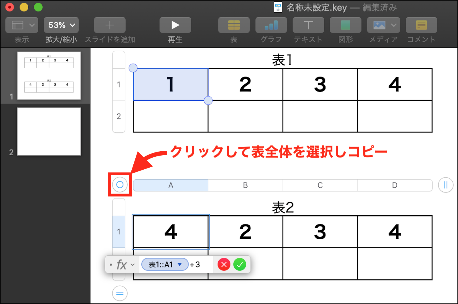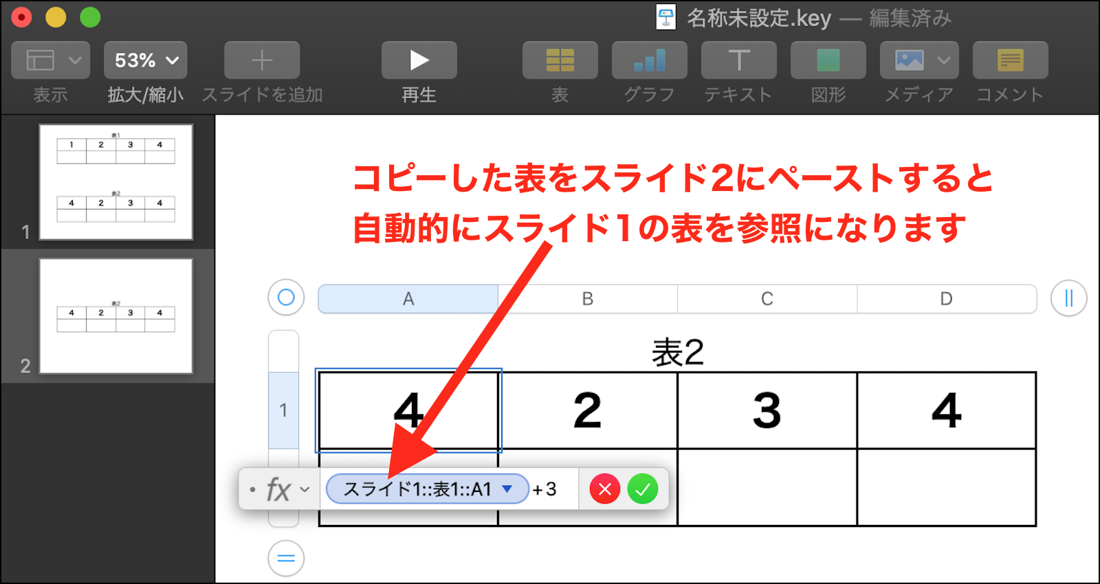 「スライド2」を選択してコピーした「表2」をペーストすると、下の画像の様に自動的に「スライド1」の「表1」の「A1」を参照になります。