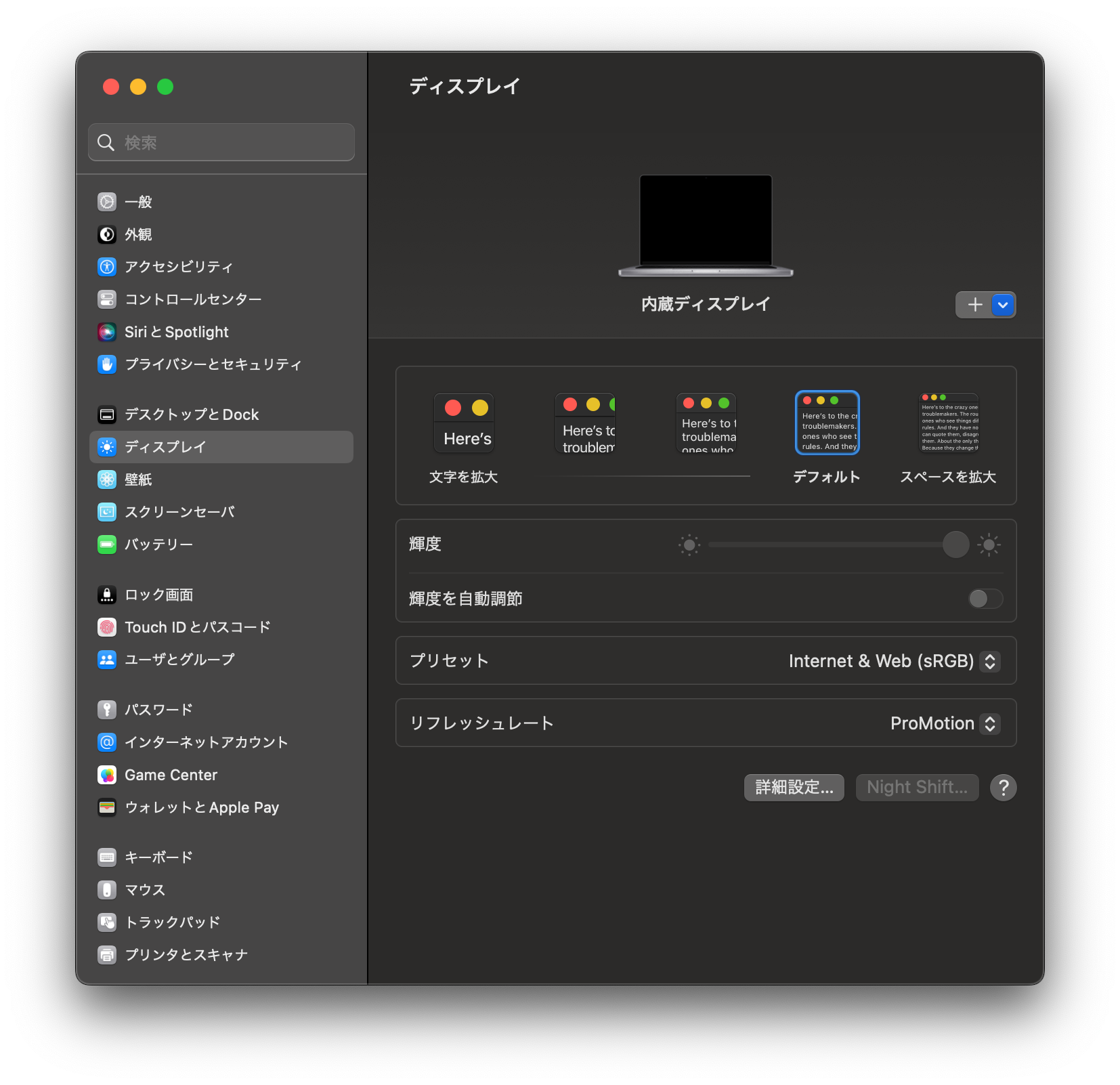 「システム設定>ディスプレイ」のプリセットを「Apple 〜」に戻す。