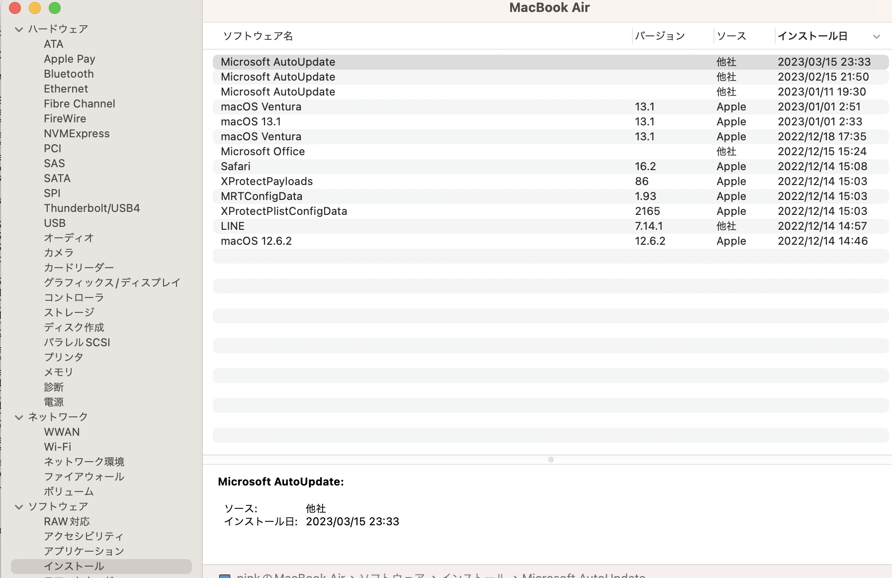 Microsoft autoupdateというのが2023年1月11日、2月15日、3月15日にインストールされていますが