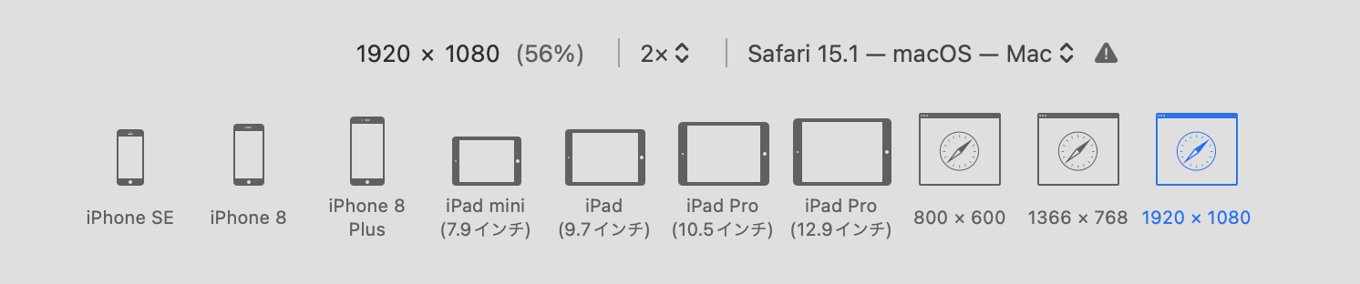 1. Safari上部のツールバー 開発⇨レスポンシブデザインモードにする⇨右端の表示を選ぶ⇨開発⇨レスポンシブデザインモードを終了