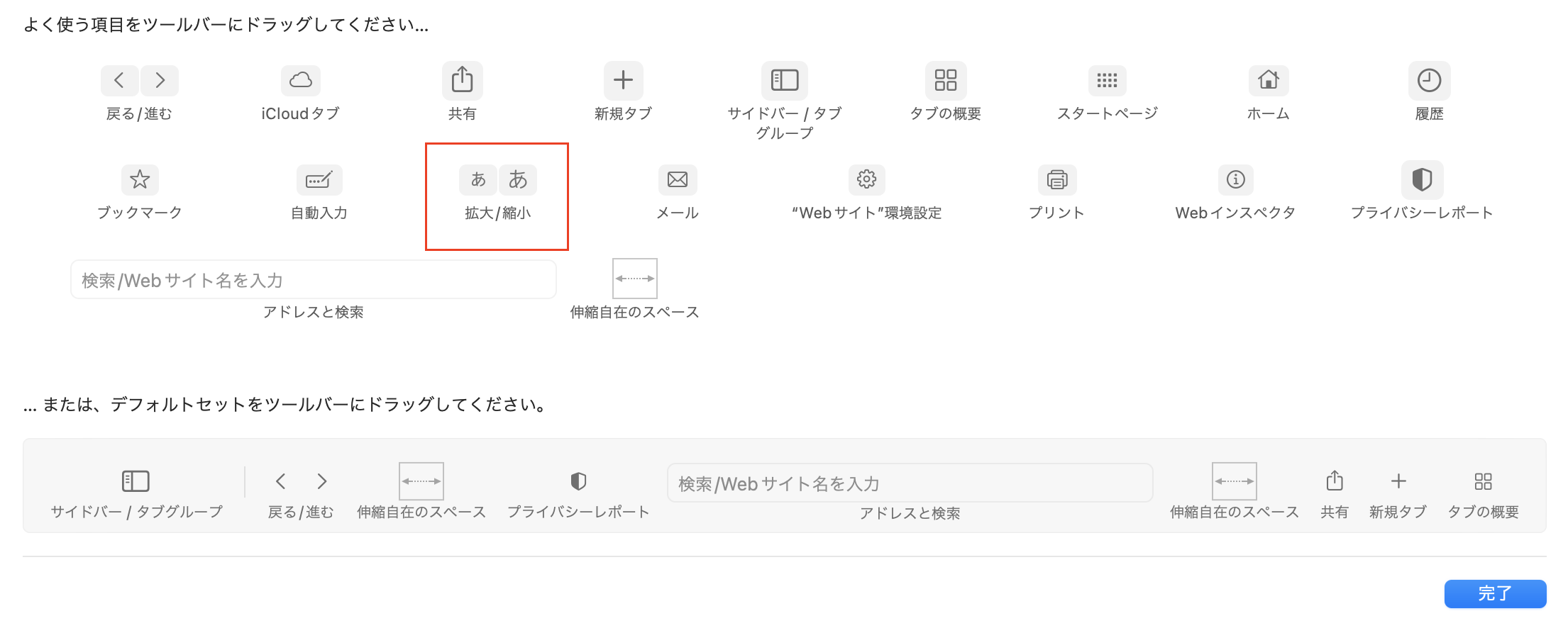 2. Safariのツールバー(アドレスの左側)にある大小のあのうち小さい方を選んで好きな大きさになるまで何回かクリック