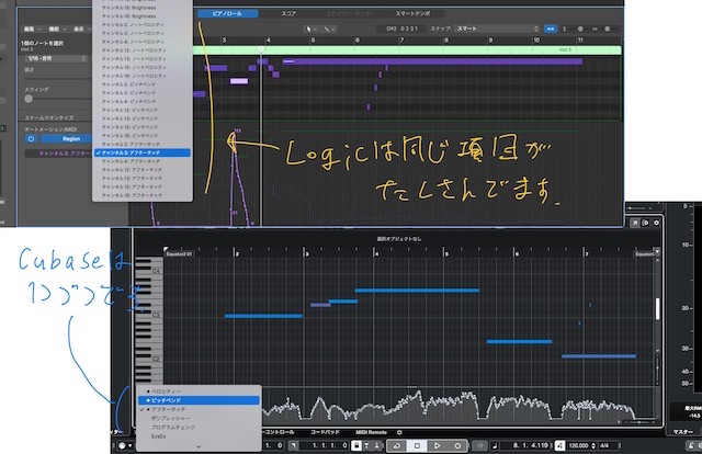 MIDIキーボードで打ち込みをして。使用中のリージョンオートメーションを確認すると同じ項目のオートメーションなのに複数に分かれてしまっています。チャンネルがいくつもあります。