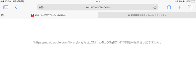 ブラウザ版 Apple Music で曲を再生し、歌詞を表示させようとするとクラッシュします