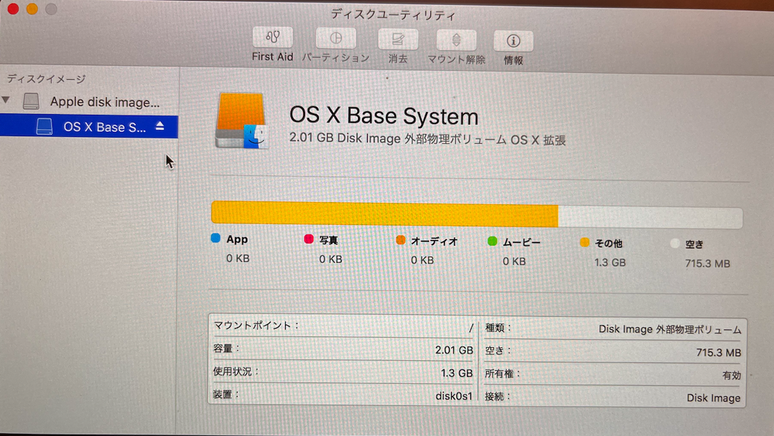 macOSユーティリティのディスクユーティリティのショットで表示されてるApple disk imageとかOS X Base SystemというのはmacOSユーティリティのディスクで、macOSのインストール先になるようなディスクではありません(サイズも2GBしかありません)。