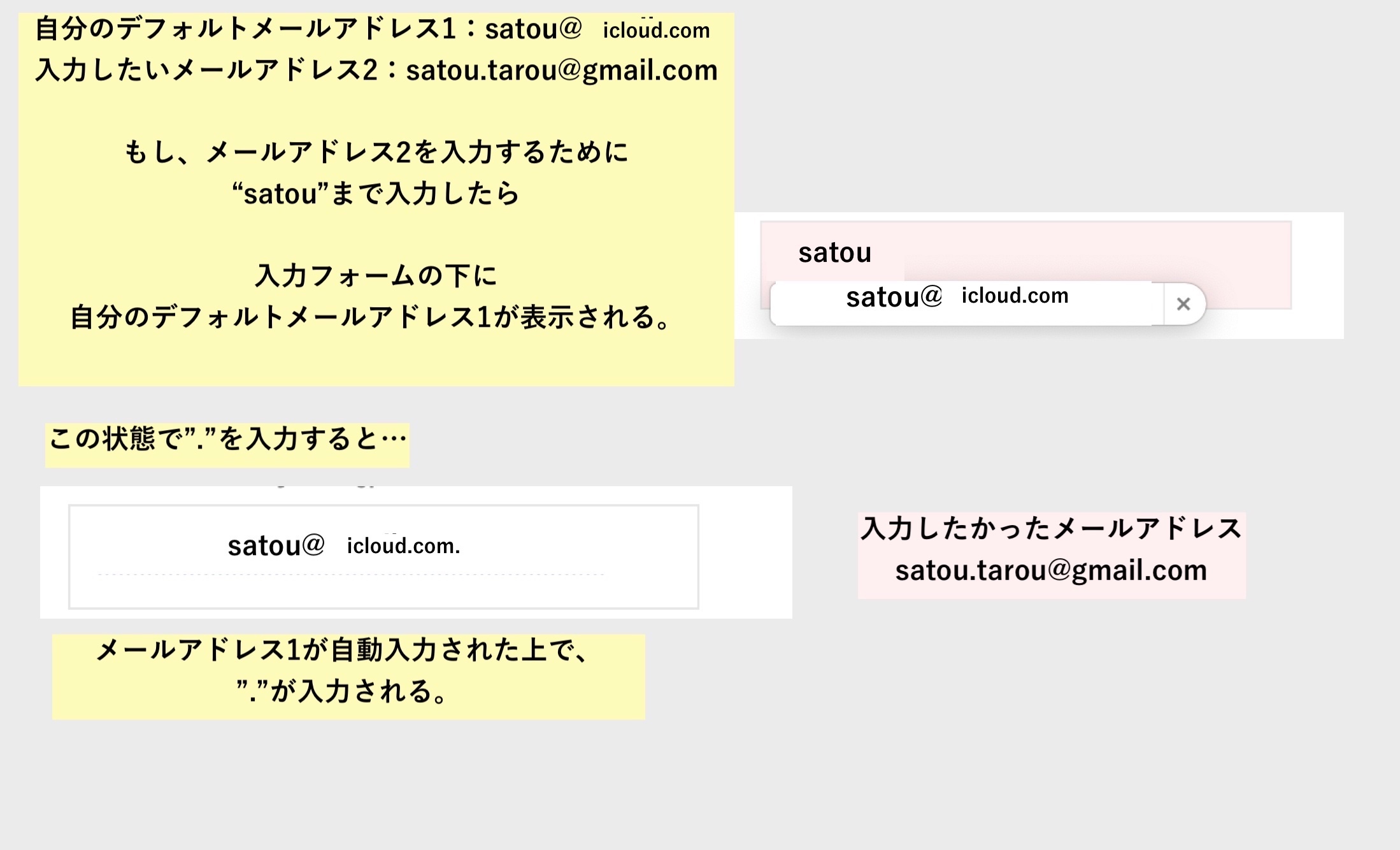 しかし"satou"まで入力した時点で「satou@icloud.comのメールアドレスだ」と認識されてしまい、この状態で何らかの操作を行うと、自動で補完されてしまう。そのせいで"satou.tarou@gmail.com"が入力できない。この機能を停止させる方法を教えてください。