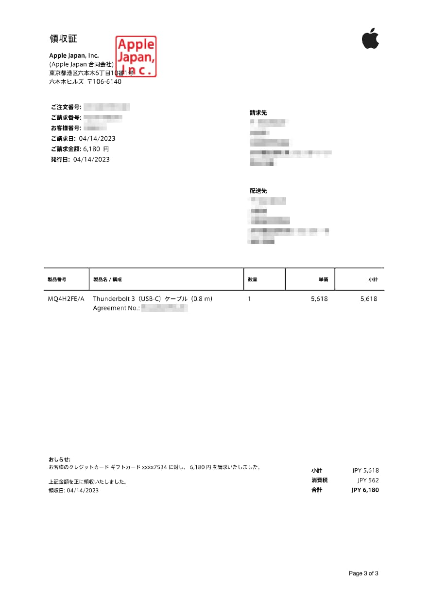 一部をギフトカードで支払ったときのAppleの領収書の記載方法は独特だと聞いたことがあります(詳細は失念しましたが、ここでも何度か話題になっていたような…)。