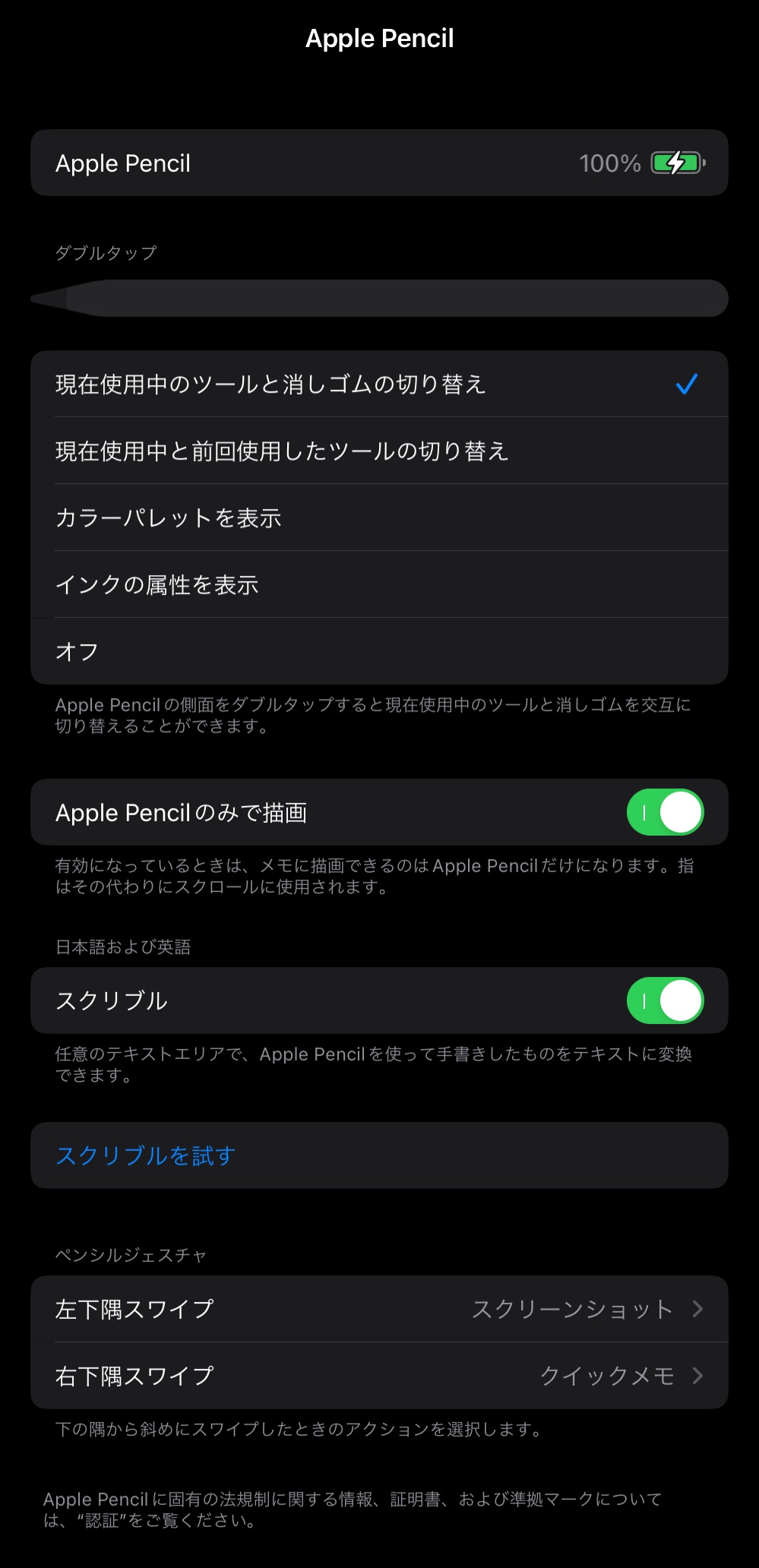 iPad Pro (第 2 世代) と Apple Pencil をペアリング - ダブルタップの設定が表示されません