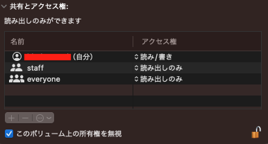 最下部にチェックボックス(空)とこのボリュームの所有権を無視という欄がありました。