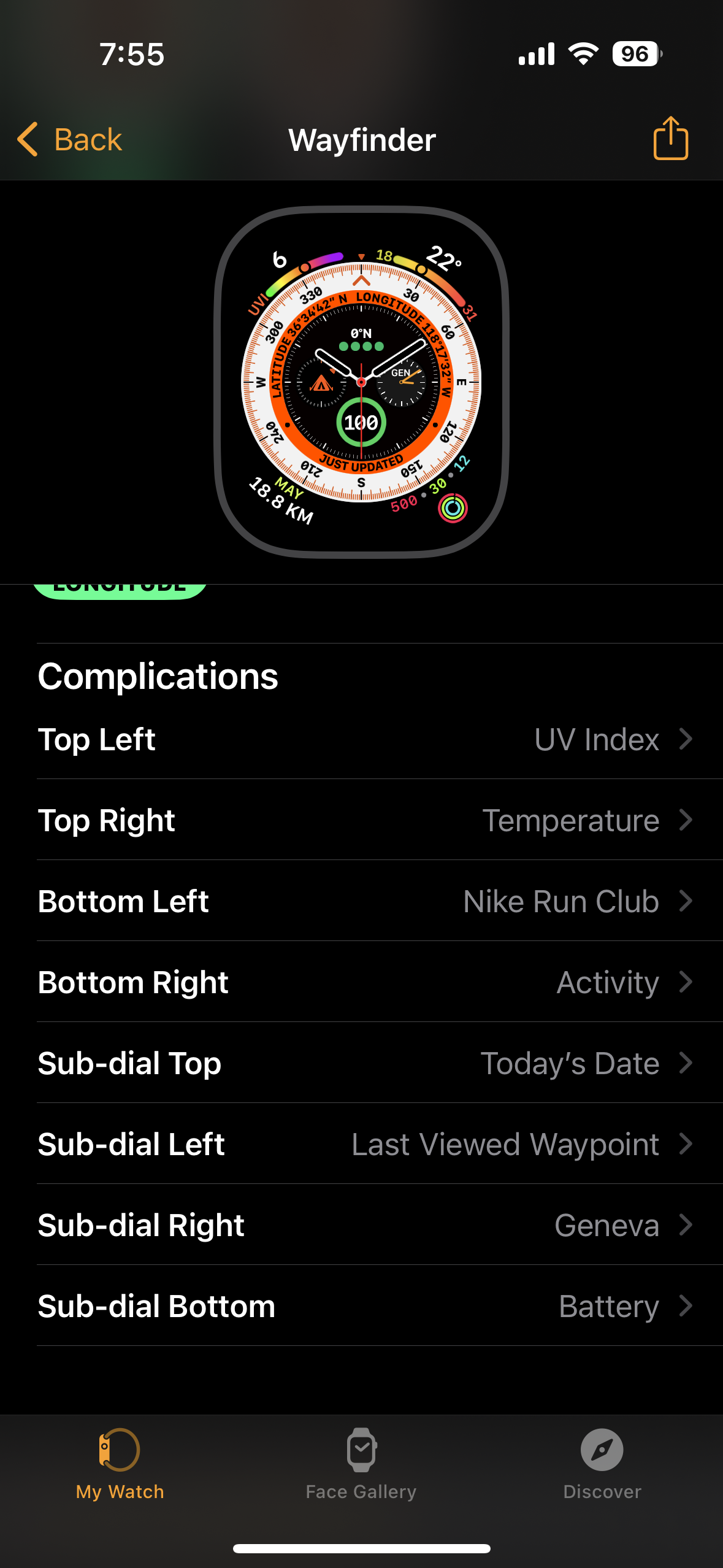 ちなみに他のアイテムを選択すると全て正常に表示され、またUltraのWayfinder以外のInfographやその他の文字盤でも同様にNikeのみ表示されなくなっています。時計の問題ではなくソフト側の問題かと感じます。ちなみにコンプリケーションを選択すると、表示されるイメージが出てきますがこちらも正常、ただし文字盤には表示されるイメージは表示されずです。スクリーンショットを添付しておきます。