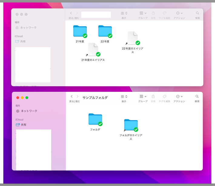 観察していくと、奇妙なことが起きていました。フォルダのエイリアスを作ると、フォルダのアイコンをしたエイリアスができますが、アイコンが書類(一枚の紙)の形をしたエイリアスにしかならないフォルダがあり、その中にあるファイルに限って、ダブルクリックでは開かないようなのです。このような奇妙なフォルダは常に同じでなく、あるときは正常なフォルダのアイコンをしたエイリアスができるのに、別の時には書類の形をしたアイコンのエイリアスになったりと、一定していないようです。
