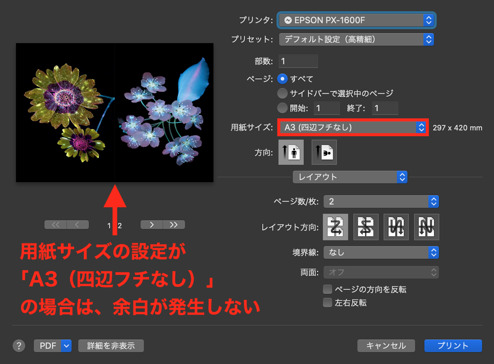 しかし、用紙サイズを「A3(四辺フチなフチなし)」に設定した場合は、下の画像の様に余白は発生しません が、Jennatoni さんの用紙サイズの設定は、どの様になっていますでしょうか?