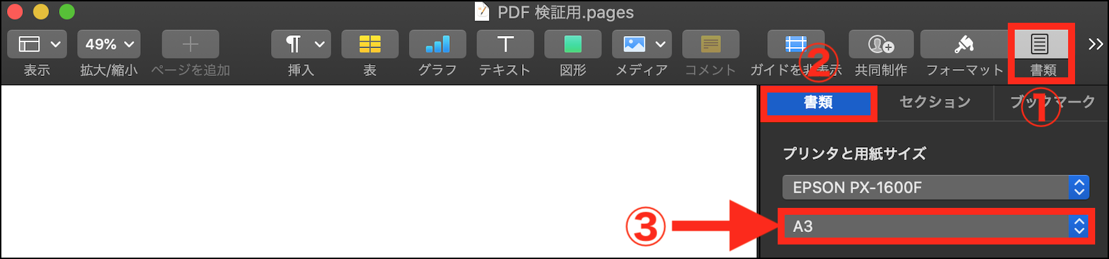 2.ツールバーの右端に有る「書類」インスペクタ >「書類」タブ >「プリンタと用紙サイズ」の項目で、用紙サイズを「A3」に設定。