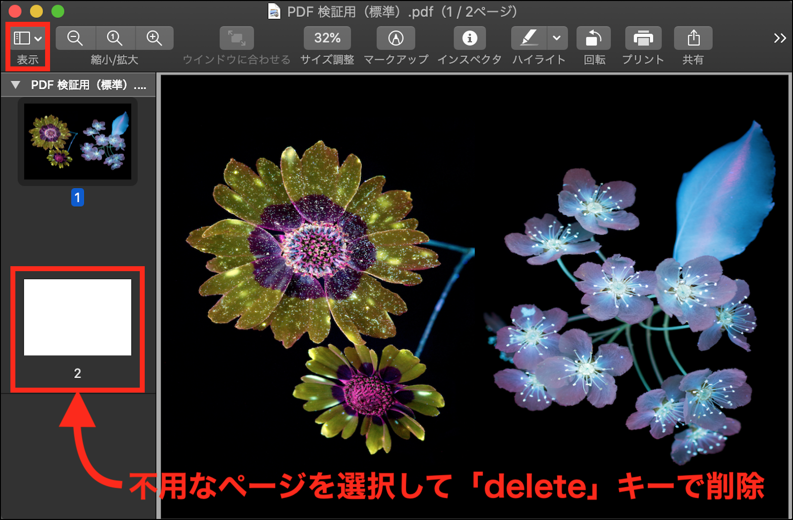「Pages」での書類作成時に、削除出来ない空白ページが自動作成される場合が有りますので、その場合は書き出した PDF 書類を「プレビュー.app」で開き、サイドバーの不用なページのサムネールを選択して、「delete」キーで削除して下さい。