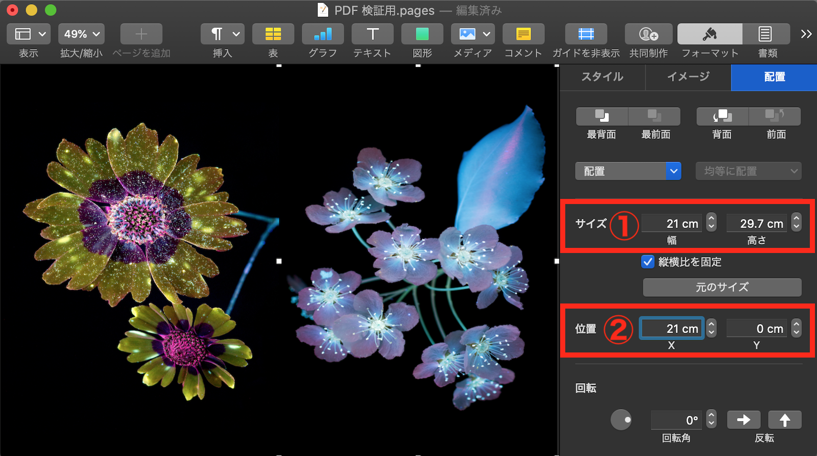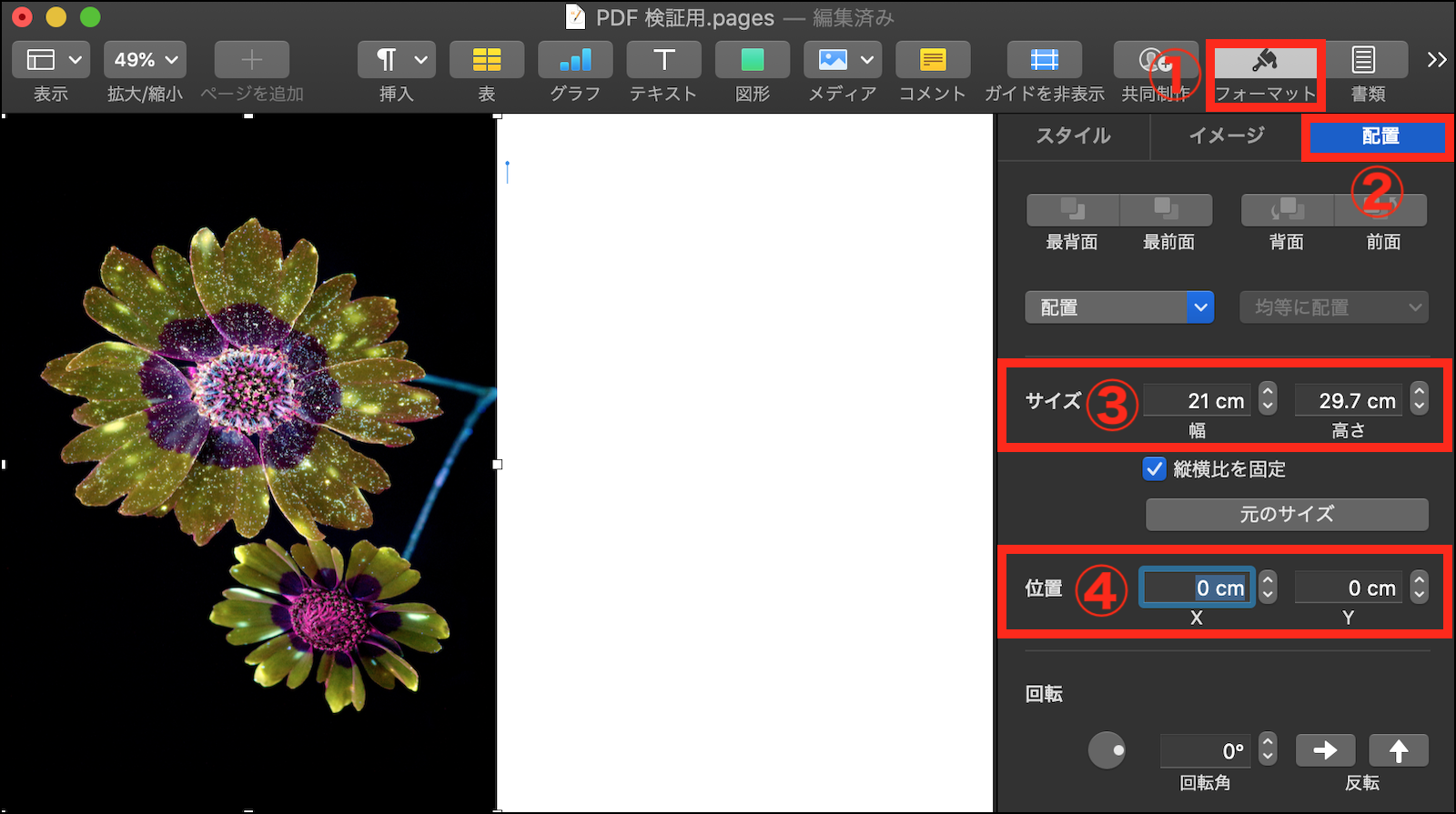 4.ツールバーの「フォーマット」インスペクタ >「配置」タブ で、「サイズ」の項目を「幅:21 cm」、「高さ:29.7 cm」に設定し、「位置」の項目を「X:0 cm」、「Y:0 cm」に設定。