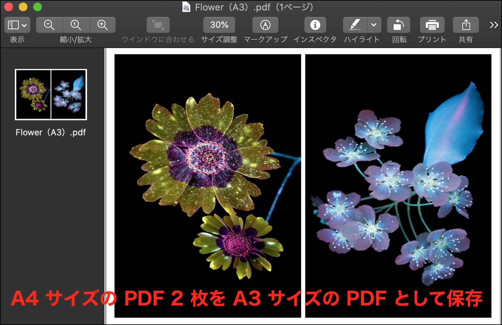 (残念ながら、「プレビュー.app」で直接 A4 サイズの PDF 2 枚を、余白無しで A3 サイズの PDF にする事は出来ない 様です)