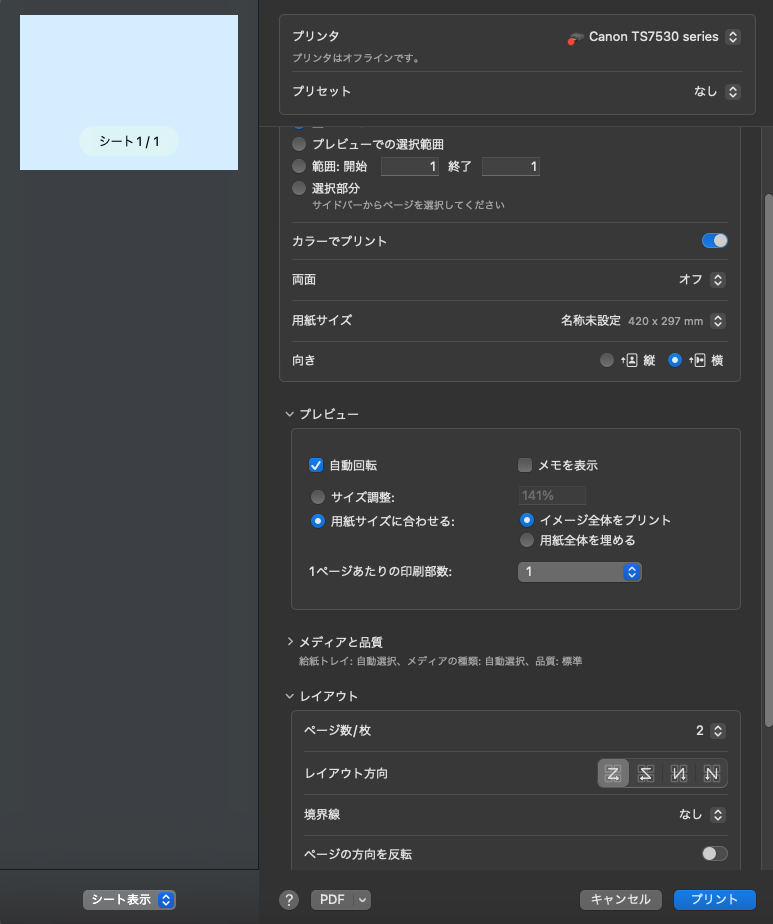 「プレビュー.app」のプリント設定で、「用紙サイズ:A3」でプリントしようとすると、確かに下の画像の様に余白が発生しますね。