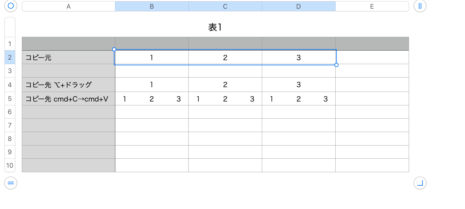 Numbersで複数セルをキーボードショートカットでコピペする