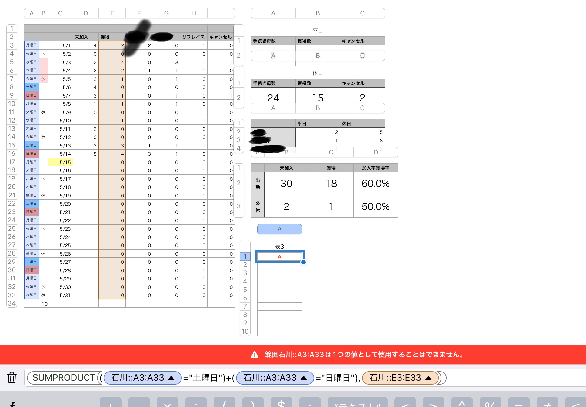 他に方法はないかとSUMPRODUCTでも現状画像のようなエラーが出てしまっており、どうすればいいか分りません
