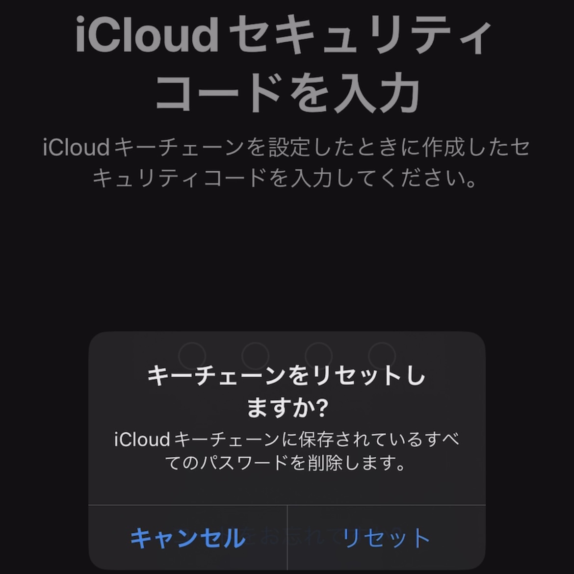 ・オンにしようとして進んでいくと、iCloudセキュリティコードをリセットする画面が出て来てリセットが何も変わらず元の画面に戻ってします。