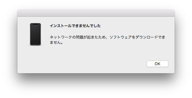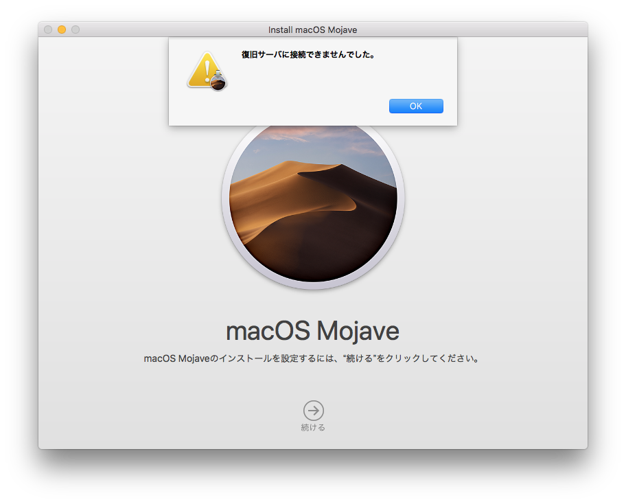 インストーラの「続ける」をクリックすると、復旧サーバに接続できない旨のメッセージが約1分後に表示されます。