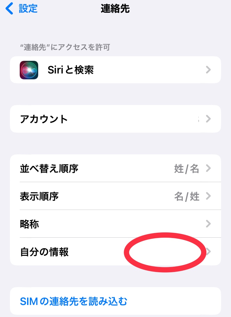 今マイカードに登録されている電話番号は、設定App>連絡先>「自分の情報」のところに表示されている人(あるいは会社)の電話番号です。