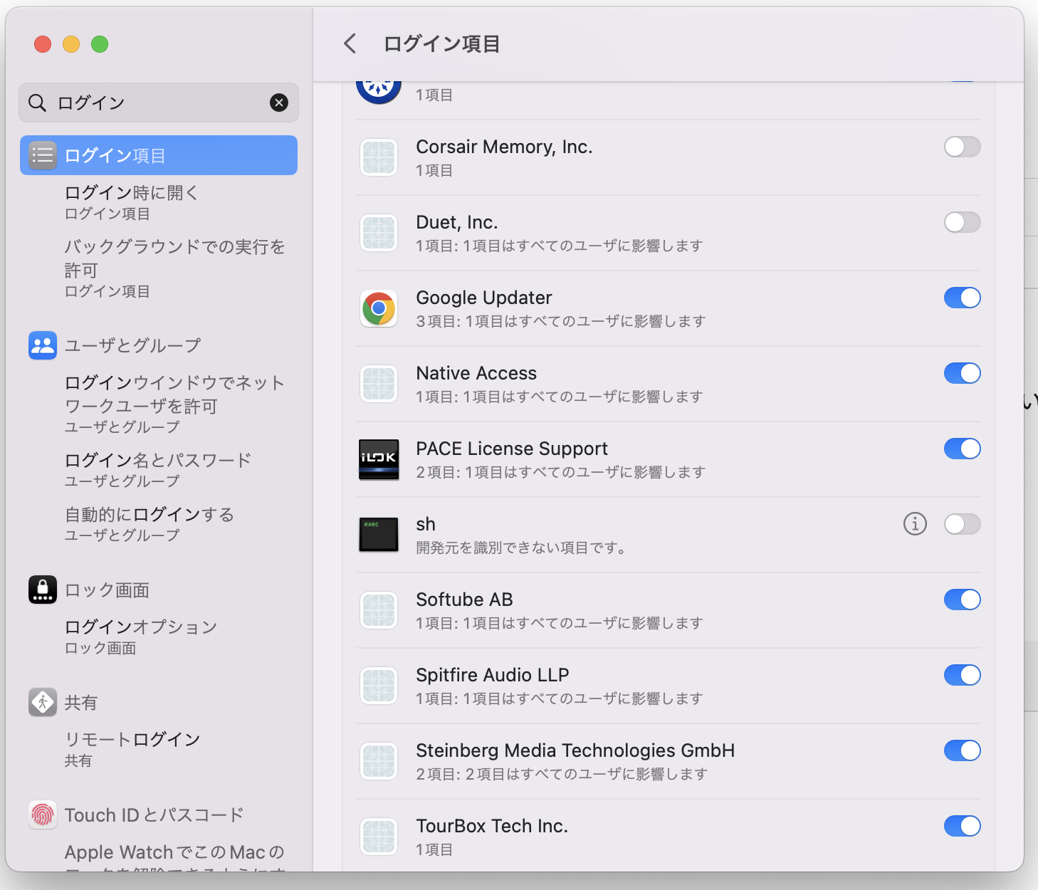 新しいソフトウェアをインストールした記憶がないのですがshというものがログイン項目に追加されていました…