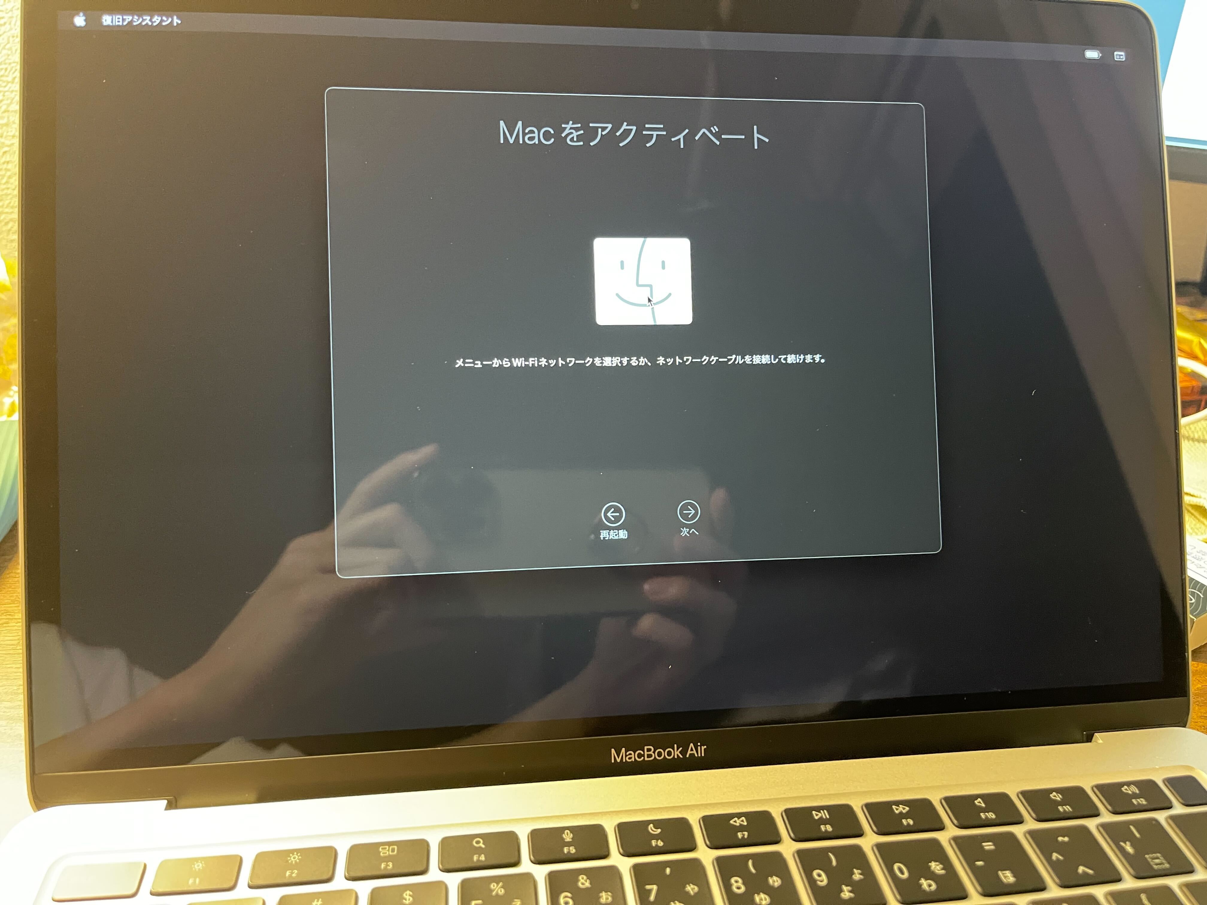 電源ボタン長押しで強制終了してから、電源ボタン長押しで起動して、optionアイコンを表示させ、続けるにします。そうすると、またMacをアクティベートになると思いますが、途中でWiFiに接続するメニュー出てきませんか?
