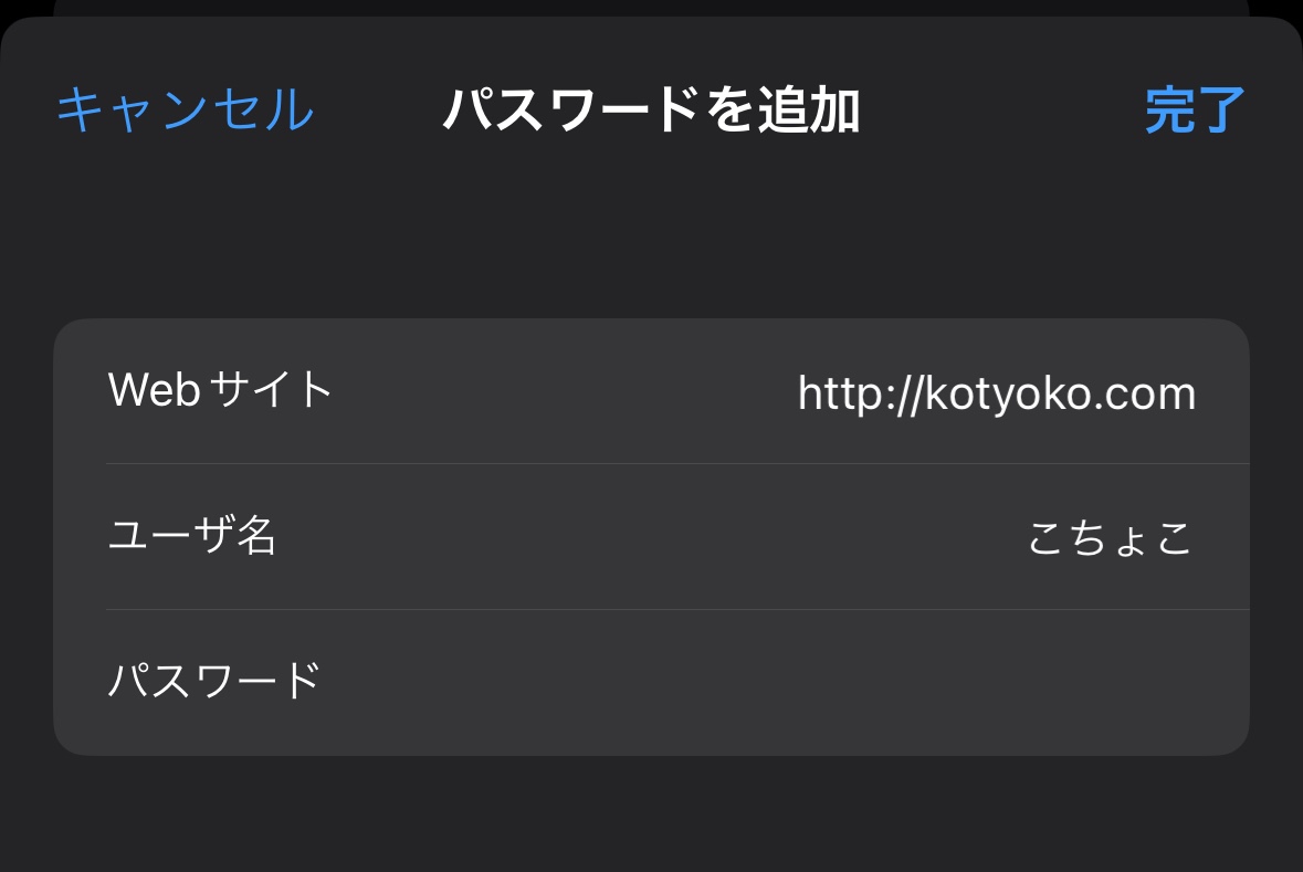 設定からパスワードを追加したいのですが、➕マークを押してwebサイト.ユーザー名、パスワードを入力しても右上の完了マークの色がグレーのままで押せません