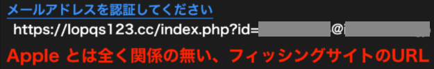 当該のメールのメール本文中のリンクは、実際には下の画像の様に、Apple とは全く関係の無いフィッシングサイトの URL になっていますので、明らかに 瑠月1224 さんの個人情報を搾取するのが目的のフィッシングメール です。