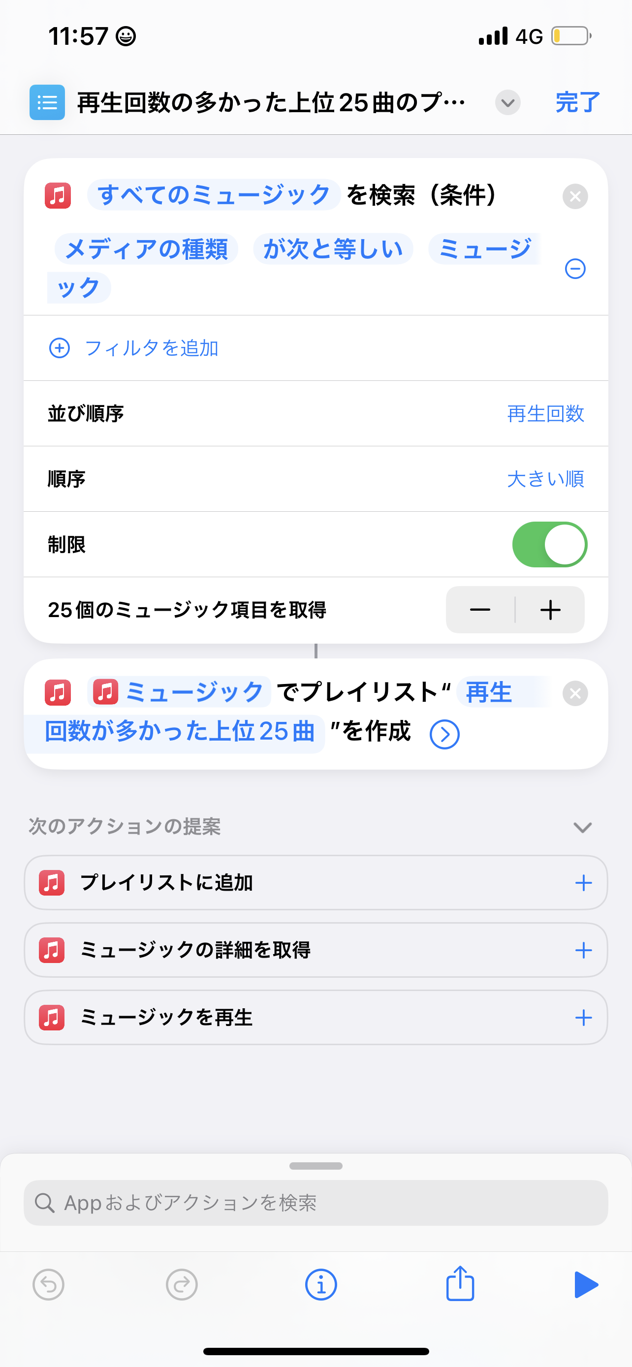 どうしてもiPhoneのみでショートカットで自動作成したい場合は、任意の名前のプレイリストだけを先に作成しておき、上記スクリーンショットにもある検索条件の下は「プレイリスト作成」ではなく「プレイリストに追加」を設定し作成済みのプレイリストを選択すればボタンひとつで再生数の多い25曲を追加可能できました。