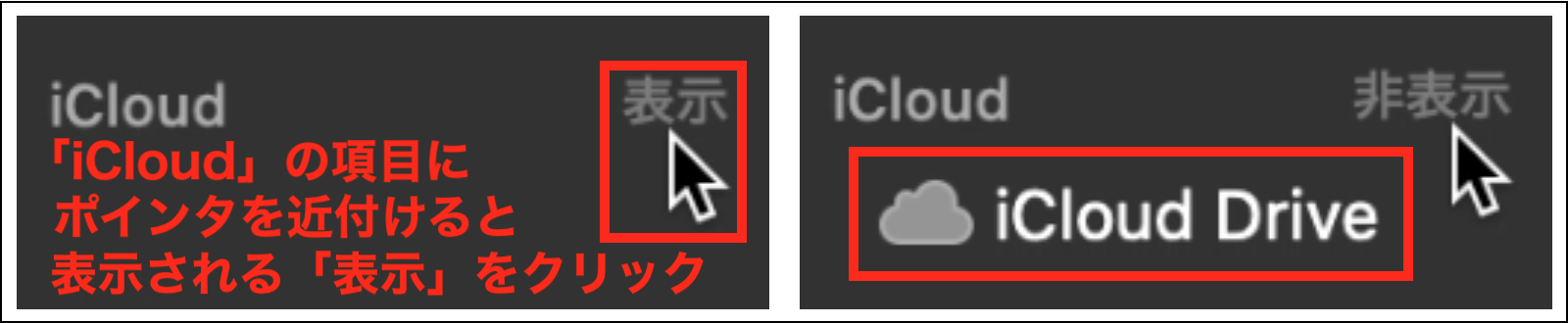 もし、「Finder」メニュー >「環境設定」>「サイドバー」タブで、「iCloud Drive」の項目が有効になっているのに、「Finder」のサイドバーに「iCloud Drive」の項目が表示されない場合は、「iCloud」内の項目が非表示 になっている可能性が有りますので、下の画像の様に「Finder」のサイドバーで「iCloud」の項目にマウスポインタを近付けると表示される「表示」をクリックして、「iCloud Drive」の項目を表示 させて見て下さい。