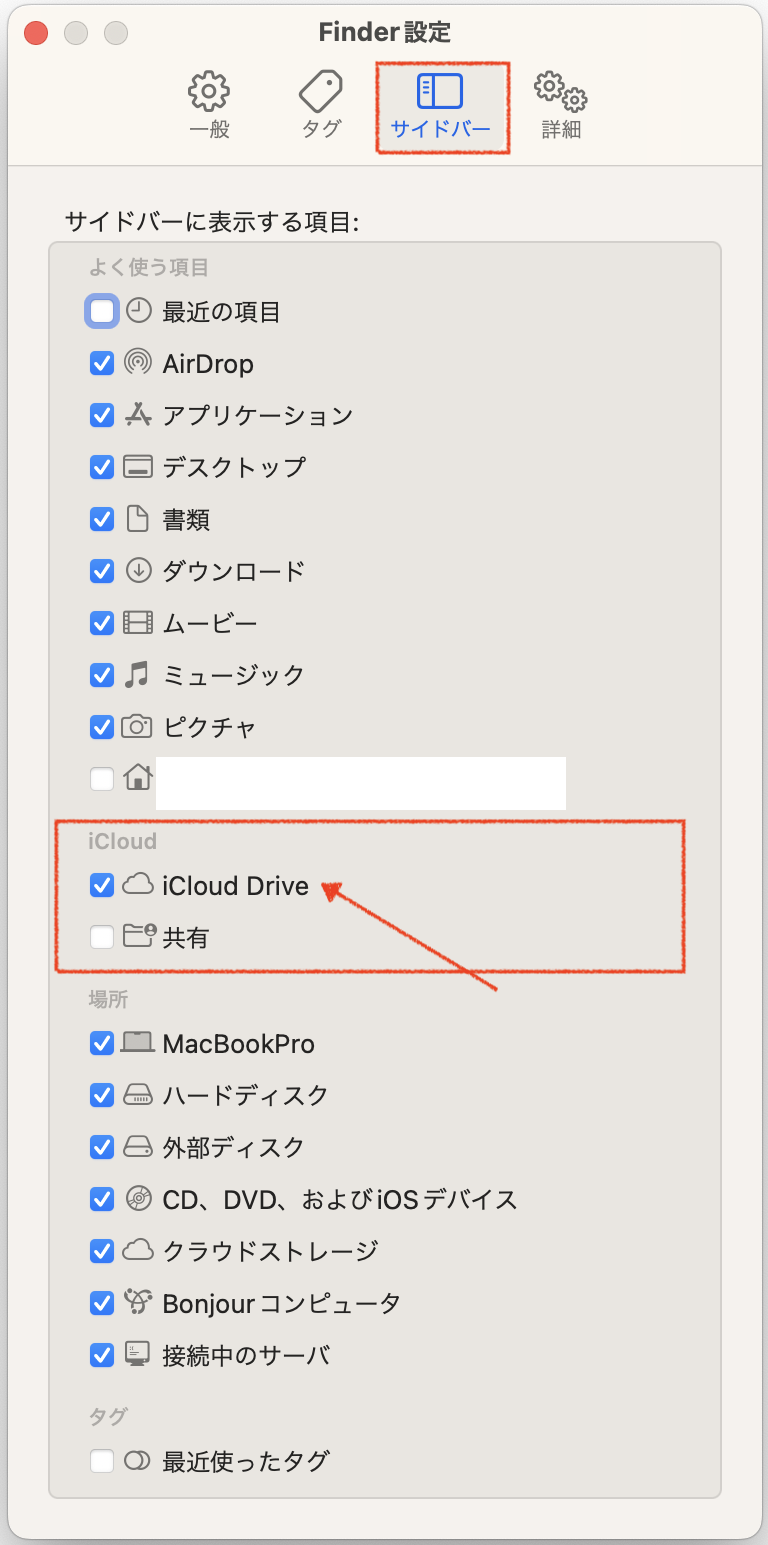 「Finder」メニュー >「環境設定」>「サイドバー」タブは、「Finder」のサイドバーに項目を表示させるかどうかを決定する為の設定ですので、ここで「iCloud Drive」の項目が有効になっていない場合は、当然「Finder」のサイドバーに「iCloud Drive」の項目は表示されません。