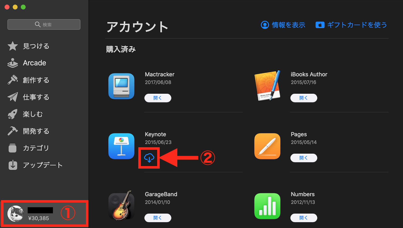 「購入済み」画面で「Keynote」が表示されている場合は、下の画像の様に 「購入済み」画面で、「Keynote」の右下のダウンロードアイコンをクリックして、現在の環境で使用可能なバージョンの「Keynote」を再インストール して下さい。