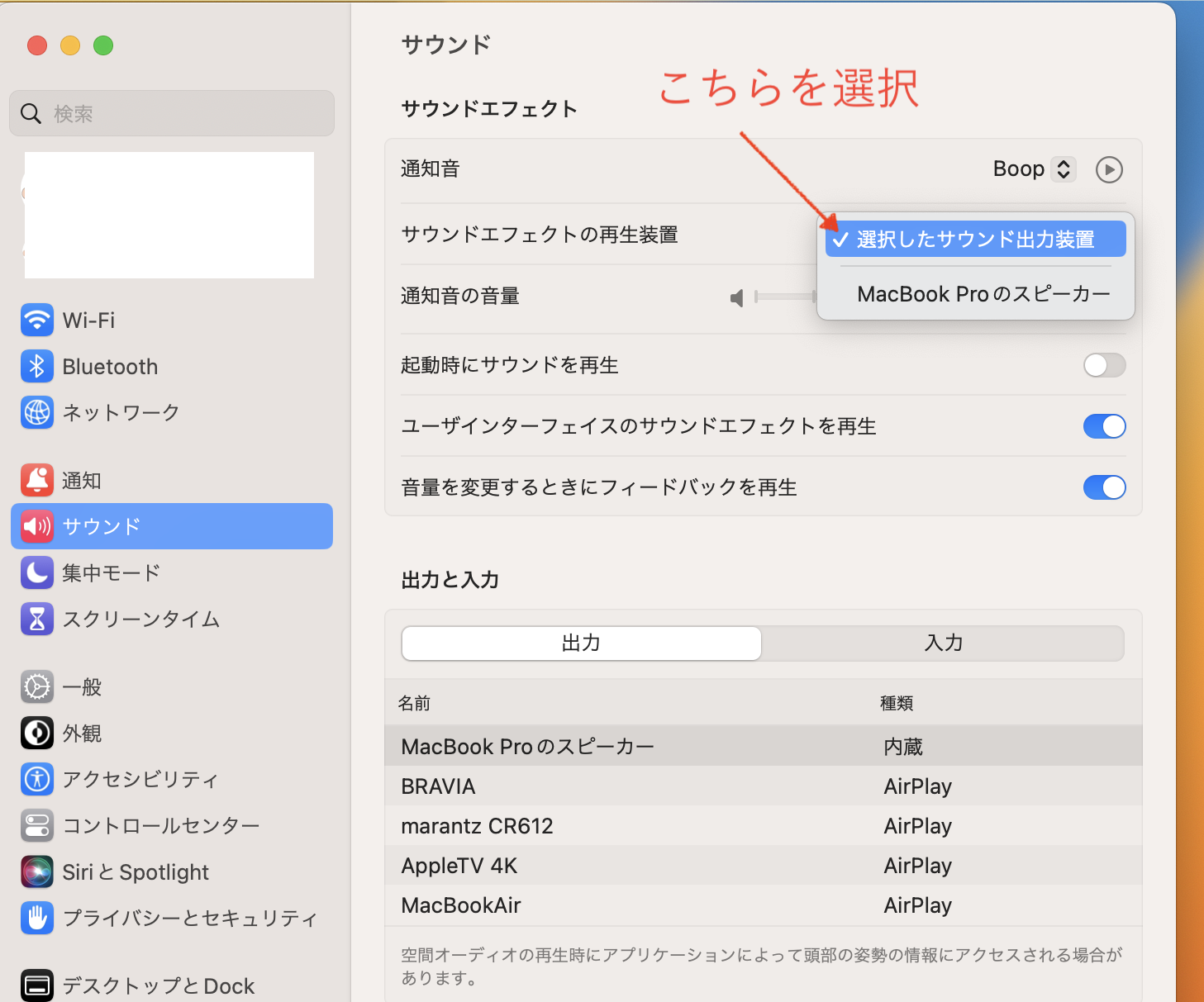 MacBook Proの「システム設定>サウンド>サウンドエフェクトの再生装置」を”選択したサウンド出力装置”に設定したらどうでしょう。