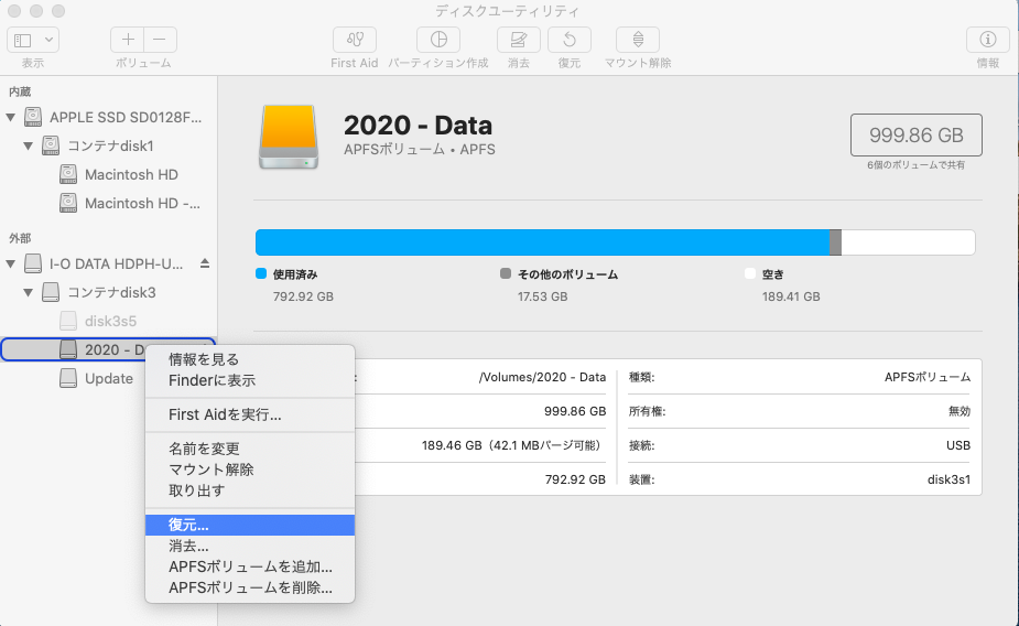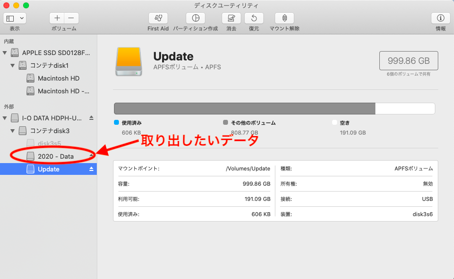 ディスクユーティリティーで容量を見ると取り出したい状態の時の名前と情報は見つけられました。
