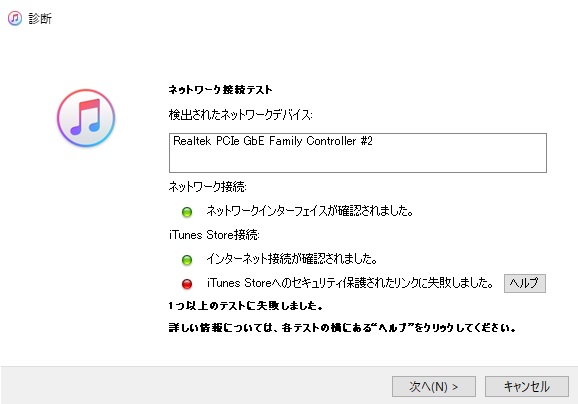 診断を開始すると『iTunes storeへのセキュリティ保護されたリンクに失敗しました』とあります。